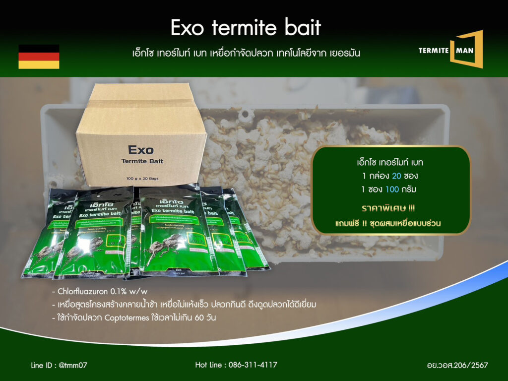 - เอ็กโซ เทอร์ไมท์ เบท ( Exo Termite Bait ) เหยื่อกำจัดปลวก นวัตกรรมล่าสุด เทคโนโลยีจาก “เยอรมัน” กำจัดปลวกตายยกรัง ด้วยพลังเหยื่อ เอ็กโซ เทอร์ไมท์ เบท เราได้ทดลองเก็บข้อมูลประสิทธิภาพมาแล้วจริง ๆ และได้ขึ้นทะเบียนการค้าถูกต้องตามกฎหมายทุกอย่าง